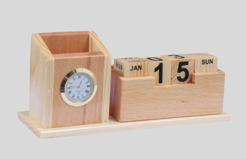 Stay organized and on schedule with the DK-5204 Wooden Pen Stand with Clock and Perpetual Calendar—a versatile, multifunctional wooden accessory blending classic design with everyday utility. Handcrafted from high-quality natural wood, this organizer features a spacious pen holder, an embedded analog clock with Roman numerals, and a perpetual calendar with adjustable blocks for endless yearly use.