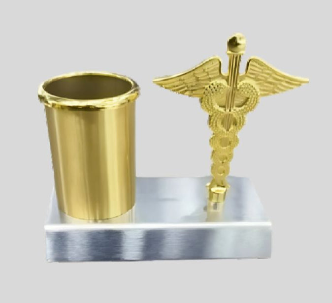 Honor the healer with the DK-M523 Caduceus Pen Stand, an elegant and symbolic desk organizer that pays perfect tribute to the medical profession. The centerpiece is a beautifully crafted, golden Caduceus emblem, representing medicine and healing.