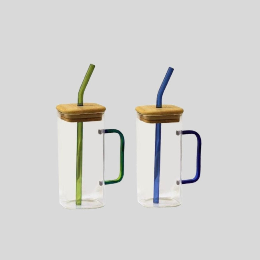 DK - Transparent Square Juice Sipper Tumbler with Wooden Lid & Straw – Premium Glass Mug 966