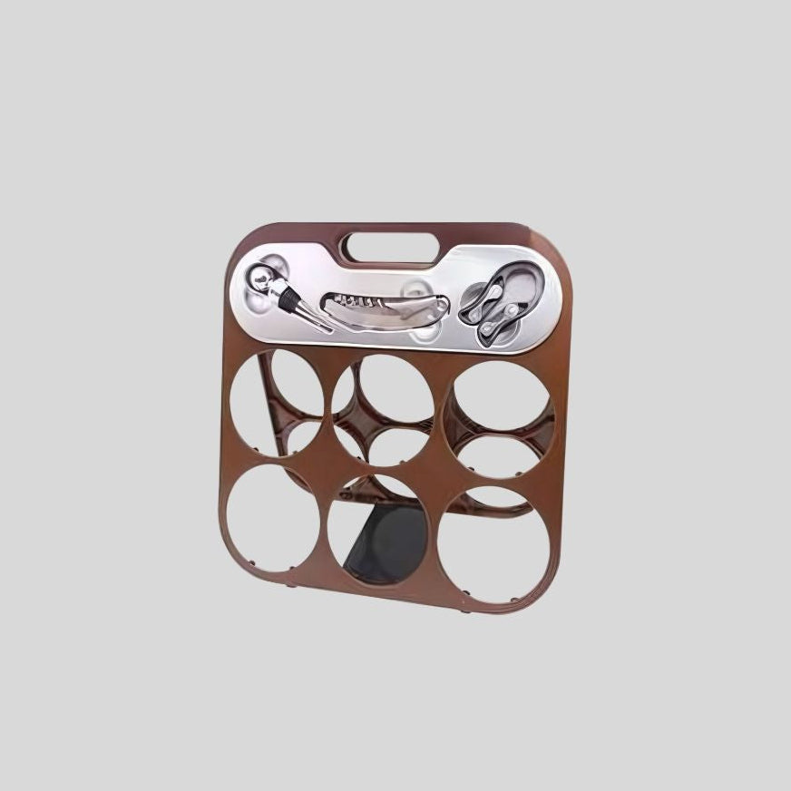 Upgrade your bar setup or corporate gifting collection with this stylish Wooden Wine Bottle Rack, designed to hold up to 6 bottles. Perfectly combining elegance and functionality, this wine rack features a sleek, foldable design for easy storage and portability. The set includes essential bar tools—such as a corkscrew, bottle stopper, and foil cutter—conveniently housed within a polished metallic tray at the top for all your wine serving needs.